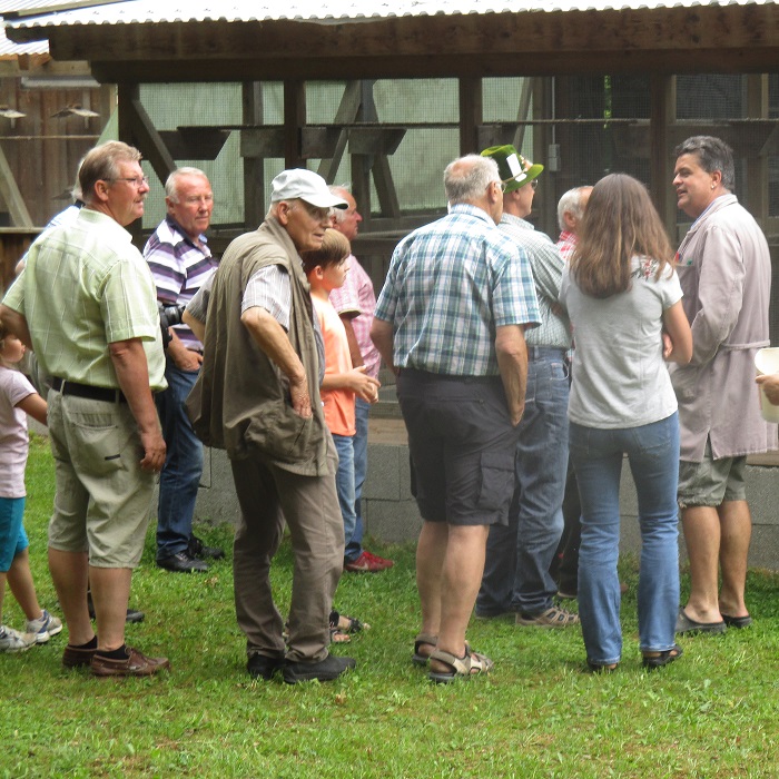 Am 9. Juni durfte ich eine Gruppe Tauben- und Geflügelzüchter aus dem Kreisverband Rosenheim bei mir als Gäste willkommen heißen. Hans Joachim Schwarz hatte diese Fahrt organisiert, an der Zuchtfreunde vom GZV Rosenheim, GZV Miesbach und GZV Bad Aibling teilnahmen. Nach kurzer Begrüßung gab es zunächst eine Brotzeit im Freien. Anschließend führte ich die Gruppe durch meine Zuchtanlage und zeigte den interessierten Gäste meine Tiere: Federfüßige Zwerghühner goldhalsig, Zwergwyandotten orangefarbig gebändert, Luchstauben blau weißgeschuppt und selbstverständlich meine Verkehrtflügelkröpfer. Es war für mich eine schöne Bestätigung, zu sehen, mit welchem Interesse andere Züchter meine Tauben und Hühner betrachteten. Die Zeit verging natürlich zu schnell und nach einigen Stunden und vielen interessanten Gesprächen wurde wieder Abschied genommen, nicht ohne einander noch viel Erfolg bei der Zucht zu wünschen. Spätestens bei den Ausstellungen im Herbst und Winter sieht man sich dann wieder.